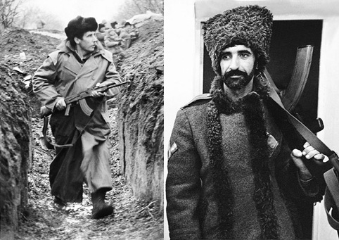 Sute de romani (foto stanga) au fost ucisi de fortele Armatei a 14-a ruse intarite de cazaci (foto dreapta) si trupele speciale OMON.