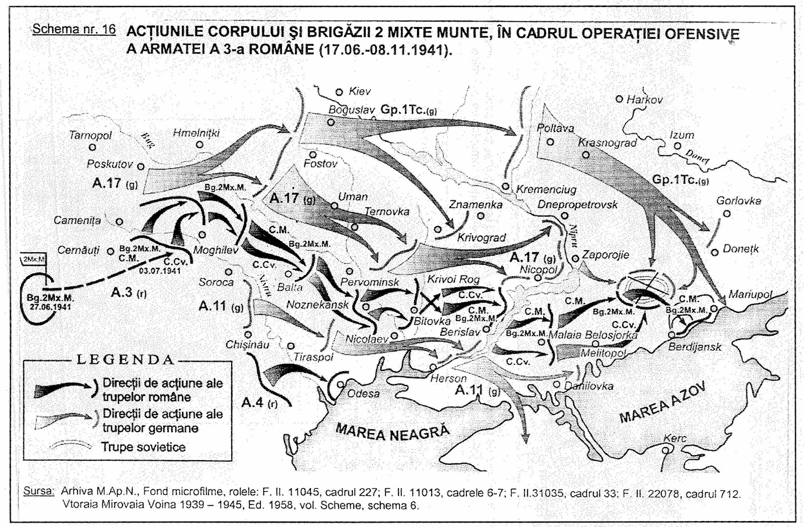 Corpul de Munte, compus din Brigăzile 1, 2 și 4 Mixte Munte, sub comanda generalului Gheorghe Avramescu, a luptat pentru eliberarea nordului Bucovinei, a Cernauțiului și Hotinului, apoi a forțat Nistrul la Moghilev, o decizie obligatorie în economia luptelor (vezi Ne puteam opri pe Nistru?), apoi a continuat avansul prin Ucraina în cadrul Armatei a 3-a române, alături de Armata a 11-a germană. Armata a 4-a română, după ce a eliberat sudul Basarabiei, a trecut Nistrul și a avansat pivotând spre sud pentru cucerirea Odessei. Corpul de Munte a trecut Bugul în zilele la 21 august 1941 pe podul de la Voznesensk, ajungând la Nipru, care este trecut pe la Berislav în zilele de 16 și 17 septembrie. Marșul s-a făcut în condiții deosebit de grele, prin praf și arșiță, zi și noapte, în etape epuizante, ducând lupte continue de uzură și respingând contraatacurile sovietice. Armata a 3-a, a parcurs distanța dintre Nistru și Bug prin lupte grele, ca dovadă pierderile suferite în decursul acestui avans, de 19861 (6786 morți, 12492 răniți și 133 dispăruți). Dar și pierderile inamicului au fost mult mai mari, de exemplu, doar în ziua de 19 august 1941, în cursul luptelor de lângă Sablukovka, Kat Sarovka, Anastasievka, Mihailovka, în cursul avansului spre Krivoirog, Corpul de Cavalerie a capturat singur 12783 militari sovietici, 450 vehicule și 70 de tancuri. În prima jumătate a lui septembrie Armata a 3-a a respins încercările sovietice de a forța Niprul și a pătrunde în spatele Armatei 11 germane. La 19 septembrie, Armatei a 3-a i se ordonă să forțeze Niprul, intrând în capul de pod.