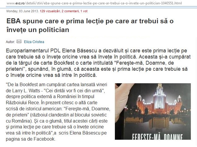 Elena Basescu - Larry Watts - Bookfest - Facebook - June 2013Mezina preşedintelui strânge bibliografie pe teme politice. Recent, Elena Băsescu a fost la târgul de carne “Bookfest” de unde şi-a achiziţionat cel mai nou volum despre politica externă a României în timpul Războiului Rece,Cei dintâi vor fi cei din urmă, semnat Larry L. Watts.