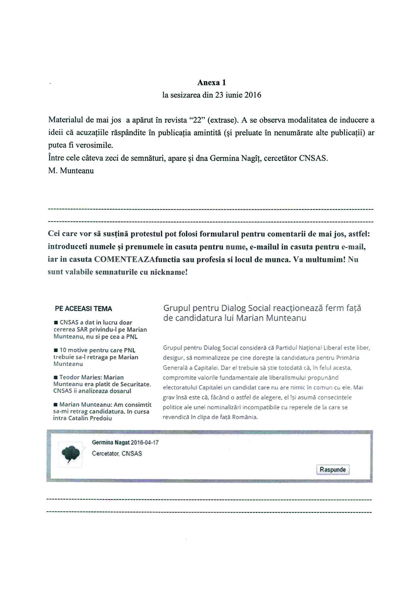 Author: eXpress - November 3, 2016 Share Twitter Facebook marian-munteanu-anexa-germina-nagit-cnsas-23-06-2016-1 ← Previous Next → Marian Munteanu spulberă cârţiţele securiste din CNSAS şi presă şi demontează campania de dezinformare şi propagandă neagră. Plângeri penale pentru Germina Nagîţ, Monica Macovei, Nicolae Manolescu. Urmează, la rând, şi alţii. DOCUMENTE Marian Munteanu spulberă cârţiţele securiste din CNSAS şi presă şi demontează campania de dezinformare şi propagandă neagră. Plângeri penale pentru Germina Nagîţ, Monica Macovei, Nicolae Manolescu. Urmează, la rând, şi alţii. DOCUMENTE