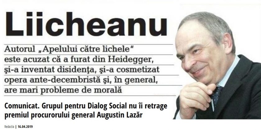 Tot zilele acestea Augustin Lazăr, procurorul comunist care i-a refuzat eliberarea din închisoarea de la Aiud, doi ani la rând, spre torturarea lui sistematică, s-a retras cu un rânjet pe buze și o pensie de aproape 6.666 de euro pe lună (30.000 lei împărțit la 4.5, cursul euro) care se adaugă la cea de 13.355 lei a soției lui, fost procuror de Alba. Conform cunoscutei ziariste Sorina Matei, artizanul și apărătorul vehement al conferirii Premiului Grupului pentru Dialog Social fostului procuror comunist a fost profitorul tuturor regimurilor Gabriel Liiceanu, alături de Andrei Cornea – fiul ideologului stalinist Paul Cornea – la care se adaugă și plagiatoarea Andreea Pora. Publicăm aici câteva rânduri ale energicului jurnalist Ion Spânu de la Cotidianul despre eroul nostru Iulius Filip și, într-o oglindă strâmbă, de bâlci, faptele de mândrie ale patronului Humanitas, Gabriel Liiceanu, așa cum au fost redate posterității de avocatul Marian Nazat și fostul vice-președinte al PNL, Dan Radu Rușanu, fost presedinte al Autorității de Supraveghere Financiară, unde Liiceanu, poreclit epocal “Liicheaua exemplară“, a făcut anticameră, ca să scuipe apoi unde a lins.