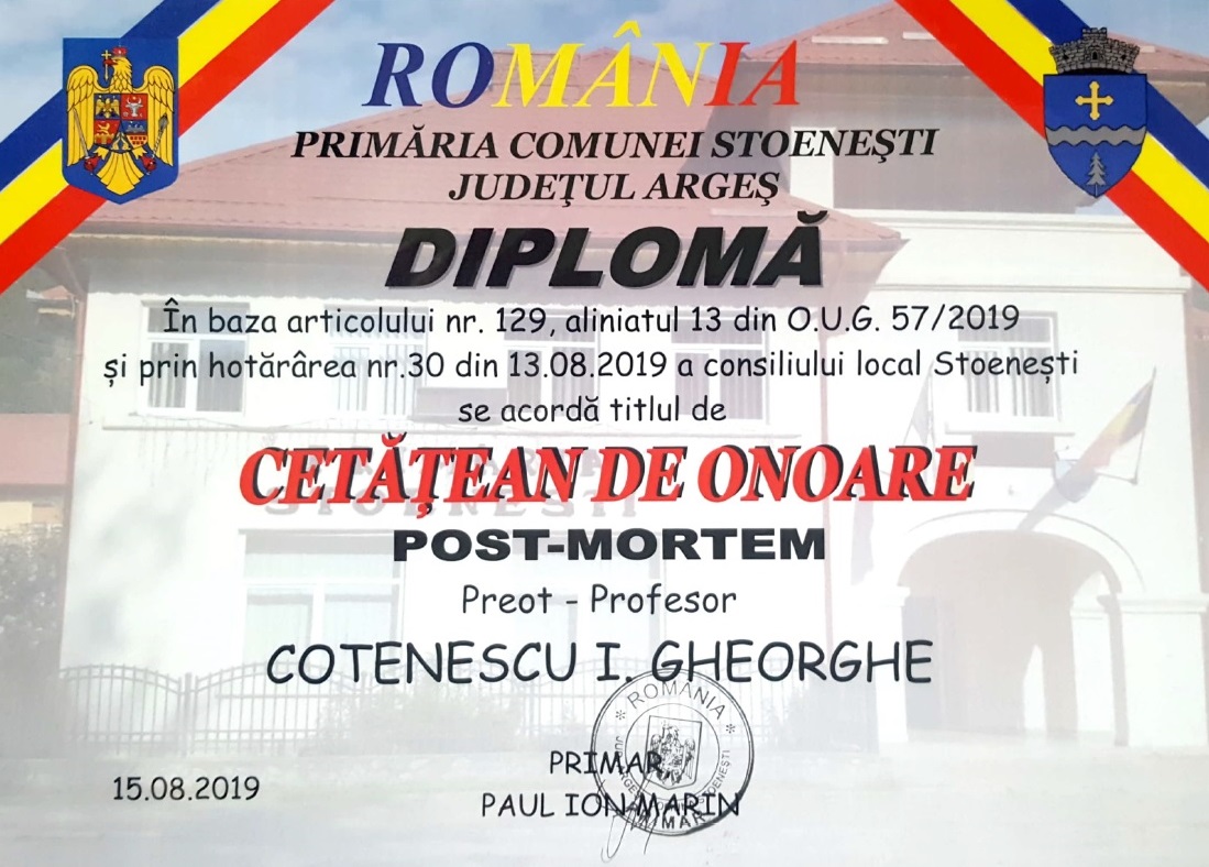 De azi inainte, preotul capitan Gheorghe I. Cotenescu, confesorul Regimentului de fier 9 Vanatori, comandat de viitorul General de Corp de Armata a la suite Gheorghe Rasoviceanu, participant, la 8 Octombrie 1939, impreuna cu ziaristul de exceptie care a fost Pamfil Seicaru, amandoi decorati cu cel mai inalt ordin militar, Mihai Viteazul, este triplu Cetatean de Onoare post-mortem in 3 localitati din 2 judete diferite, atat in Vechiul Regat, cat si in Ardeal. Din 2013, la Campulung Muscel. Din 2019, la Beius si in Stoenestii Muscelului.