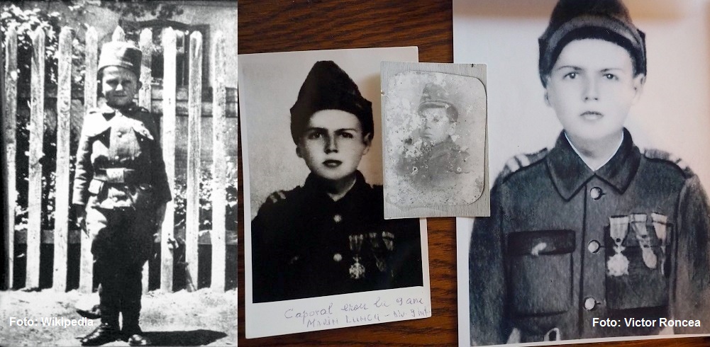 Cel mai tânar soldat al Primului Razboi Mondial este un sârb: copilul Momčilo Gavrići (foto stânga), înrolat la 7 ani și care și-a răzbunat familia ucisă sălbatic de austro-ungari – i-au spânzurat tatăl, mama, bunica, cele trei surori și cei patru frați după care au dat și foc casei. Adoptat de Divizia a 6-a de Artilerie sârbească, Momčilo le-a indicat ofițerilor pozițiile austro-ungarilor și a asistat la bombardarea lor. La 8 ani era caporal. Istoria îl consemnează drept cel mai mic combatant în Primul Război Mondial. Cel mai tânar participant și totodata erou al celui de-al Doilea Razboi Mondial este un român: Marin Lungu, zis Marinică, Spiridușul sau Nevăzutul, copil de trupă la mai puțin de 7 ani, caporal la 9 ani, azi general în rezervă. Orfan de tată și cu mama asistentă în Crucea Rosie, Marinică este primit în rândurile sale de Regimentul 40 Infanterie din Medgidia unde este instruit ca cercetaș. A trecut în liniile inamice ale trupelor horthysto-naziste de circa 30 de ori, furnizând informații despre pozițiile și efectivele militare ale acestora. În urmă cu 75 de ani, în octombrie 1944, lua parte la eliberarea Transilvaniei, a ultimei brazde de pământ românesc, a Cereiul și a comuna Urziceni, de la granița cu Ungaria, campanie în care primește pentru meritele sale trei decorații de război. Merge cu trupele românești mai departe și eliberează pentru a doua oară Budapesta, după 1919. Ajunge în Munții Tatra, unde ste prins până la urmă de nemți, în timpul unei operațiuni de culegere de informații și este azvârlit în vreo trei lagăre naziste. În urma suferințelor din lagare a rămas mut pentru o perioadă destul de lungă. Și-a revenit cu greu dupa război. A fost decorat pe front cu cele mai înalte distincții ale Armatei Române. Nu are statuie – cum ar merita! -, nu se mai știe că este cel mai tânăr participant în marele Război și mai trece și prin probleme serioase privind situația sa locativă, după ce a fost dat afară în stradă din casa primită dupa ce regimul comunist i-a demolat-o pe cea din Uranus. Nici o autoritate nu pare să vrea să respecte sacrificiile veteranului de război.