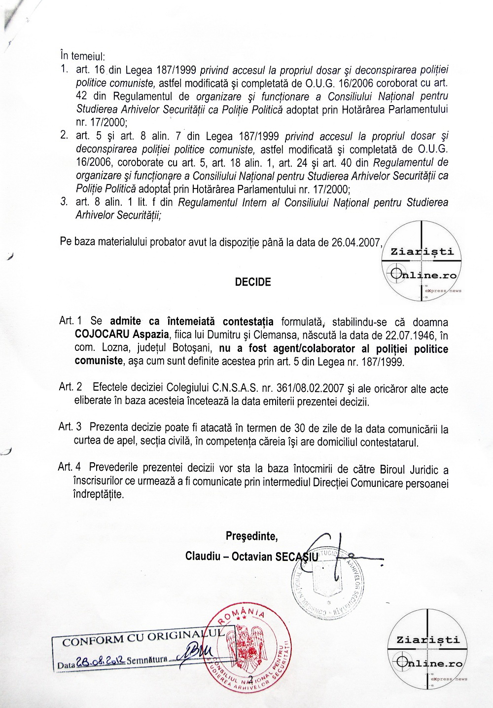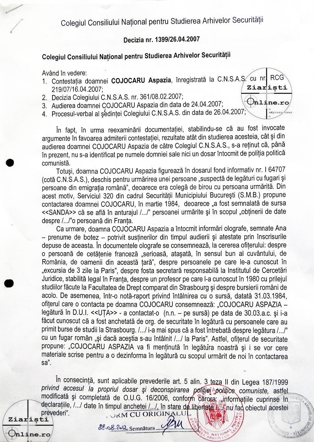 – pentru Aspazia Cojocaru Decizia 1399/26.04.2007, emisa in urma contestarii Deciziei de colaborare cu Securitate, cu nr 361/08.02.2007;