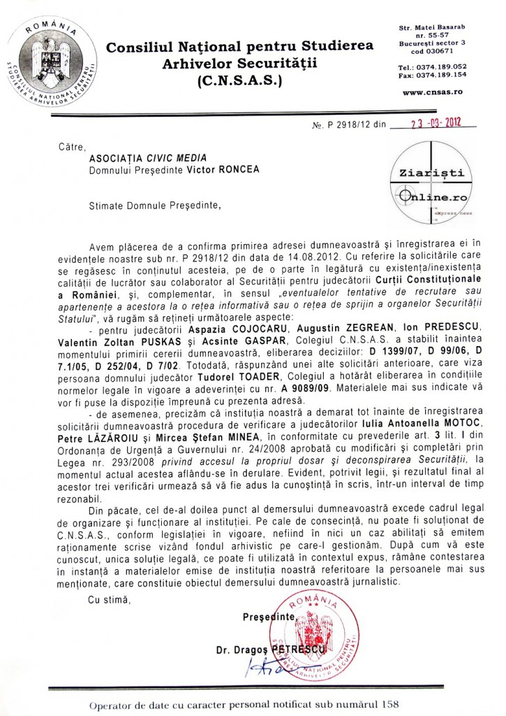 In urma unor controverse publice privind eventuala santajare a unor judecatori ai Curtii Constitutionale a Romaniei in baza trecutului lor de colaboratori ai Securitatii, Asociatia Civic Media a solicitat Consiliului National pentru Studierea Arhivelor Securitatii sa edifice opinia publica dar si clasa politica asupra aspectelor legate de posibila apartenenta a membrilor Curtii la retelele Securitatii (a celei de ieri, desigur). Portalul Ziaristi Online va prezinta in exclusivitate atat solicitarea Civic Media cat si raspunsul CNSAS insotit de Decizia de “necolaborare” in privinta Aspaziei Cojocaru, alias “ANA”, alias “UŢA” (vezi Doc mai jos), urmat de o noua cerere a Civic Media, de completare a datele ca si inexistente despre judecatorii Curtii Constitutionale, cei care decid din varful pixului lor viitorul unei natiuni.