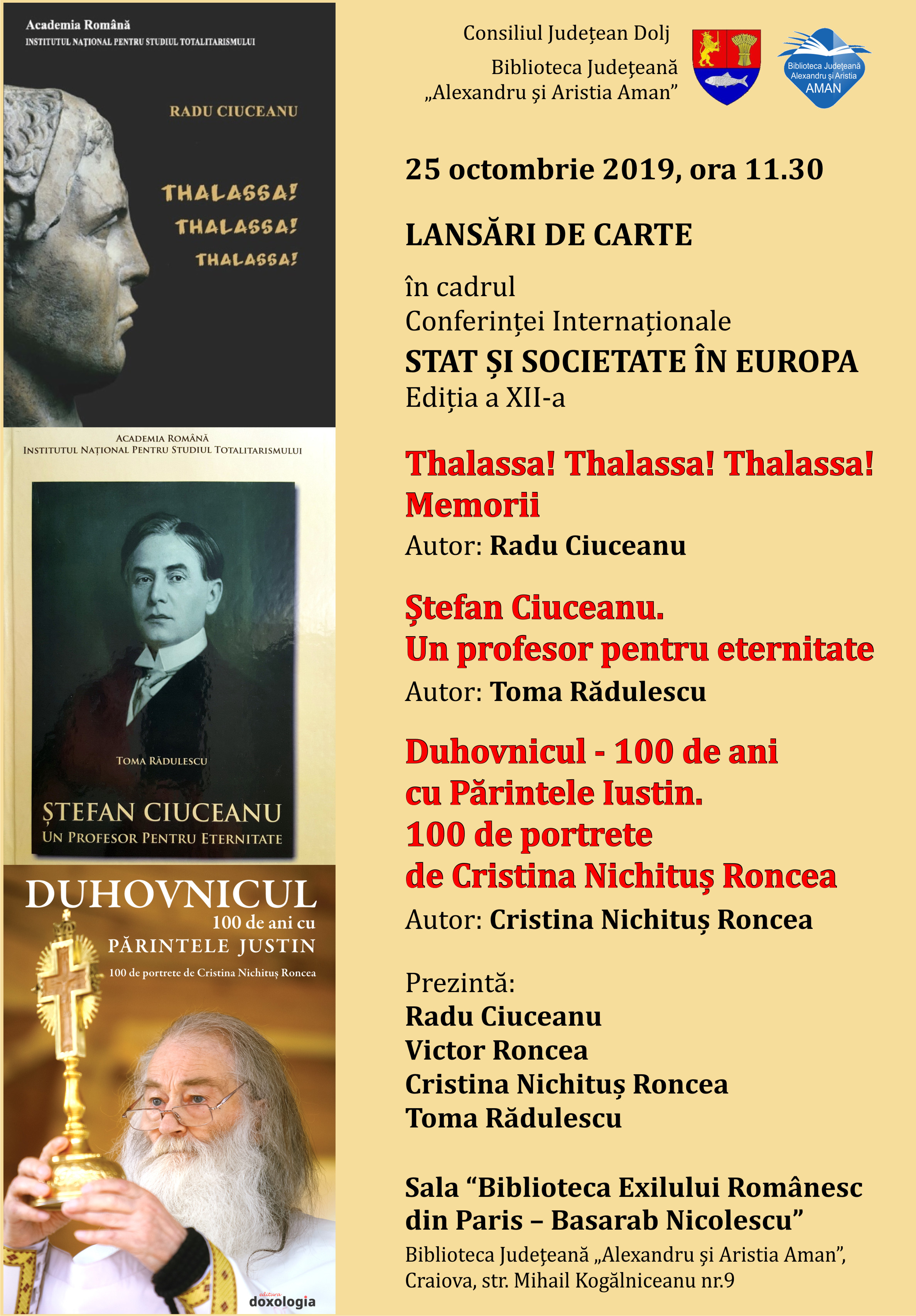 Foștii deținuți politic din Craiova, istoricii, oamenii de litere și de arte precum și toți iubitorii de frumos și adevăr au fost invitați la Biblioteca Județeană „Alexandru și Aristia Aman”, Sala “Biblioteca Exilului Românesc din Paris – Basarab Nicolescu”, la o triplă lansare de carte în cadrul Conferinței internaționale „Stat și Societate în Europa”. Este vorba de trei lucrări de memorialistică, clasică și vizuală, dedicate Părintelui Justin Pârvu și istoricului craiovean Ștefan Ciuceanu, împreună cu memoriile din închisoare ale fiului său, binecunoscut academician Radu Ciuceanu, directorul Institutului Național pentru Studiul Totalitarismului al Academiei Române.