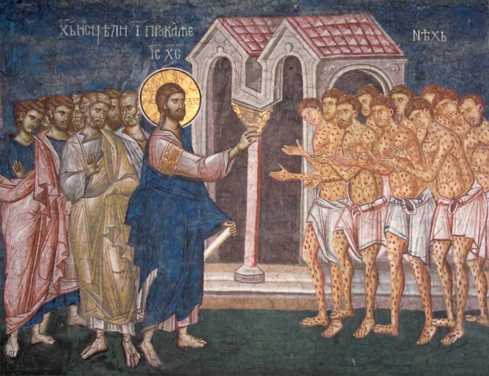 Pe acest tărâm al ”deșertăciunii” trecea Hristos, care, cum o spune singur, este Calea, Adevărul și Viața. Mai întâi, Calea spre dezrobirea de moarte. Nu o cale între altele pe care mergeau ceilalți și firește păcătuiau crezându-se suverani și, în fapt, fiind victime sigure ale tot feluri de boli aducătoare de moarte, răspândindu-se degrab și decimând mulțime. Între ele, poate cea mai cumplită, era lepra care, pe deasupra, izola omenii, făcându-i un fel de paria ai cetății, dacă nu mai rău. Datorată unei bacterii împotriva căreia nu există nici astăzi un tratament eficient, ci doar paliativ, lepra acoperă, încetul cu încetul, întreg corpul cu pete albe și plăgi febrile făcând ca trupul să intre într-un fel de proces degenerativ, evoluând spre putrefacție. Mai întâi însă trupul se acoperă cu un fel de lichid care miroase îngrozitor îndepărtând orice om. Când ajunge la nivelul nasului, al gurii și ochilor este adevăratul coșmar pentru că sunt afectate simțurile și bietul om este ca un mort între vii.