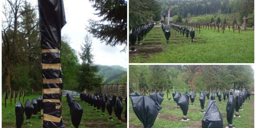 Profanare în Cimitirul Internațional de la Valea Uzului! Batjocură! Crucile de la căpătâiul eroilor români au fost acoperite cu saci negri, de plastic, pentru strâns gunoiul. Acoperite și legate strâns, la bază, să rămână acolo cât mai mult.